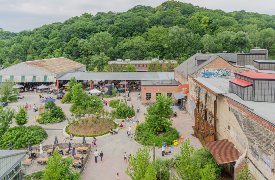 Opened in 2010, Evergreen Brick Works (550 Bayview Ave.) has become a favourite place to visit, whether it is for a special event, educational program, the Farmer’s Market, to walk your dog, skate in the winter, or even to learn about community gardening and sustainable site design. The vision to reimagine the old industrial site began with citizen action to restore the Don River in the 1980’s, and was championed by Evergreen (as their new head quarters) with multiple community and government partners. The success of the green stormwater infrastructure design (permeable concrete, bioswales, greenways, and extensive plantings) is shown by the resilient landscape that returns to pre-storm conditions, soon after extreme rainfall flooding events. Following a conceptual site design by CCxA, DTAH was engaged as the local landscape architect to help make the vision a reality. Circular tree plantings on raised mounds allowed for adequate soil volumes, and to not disturb the contaminated soil below.