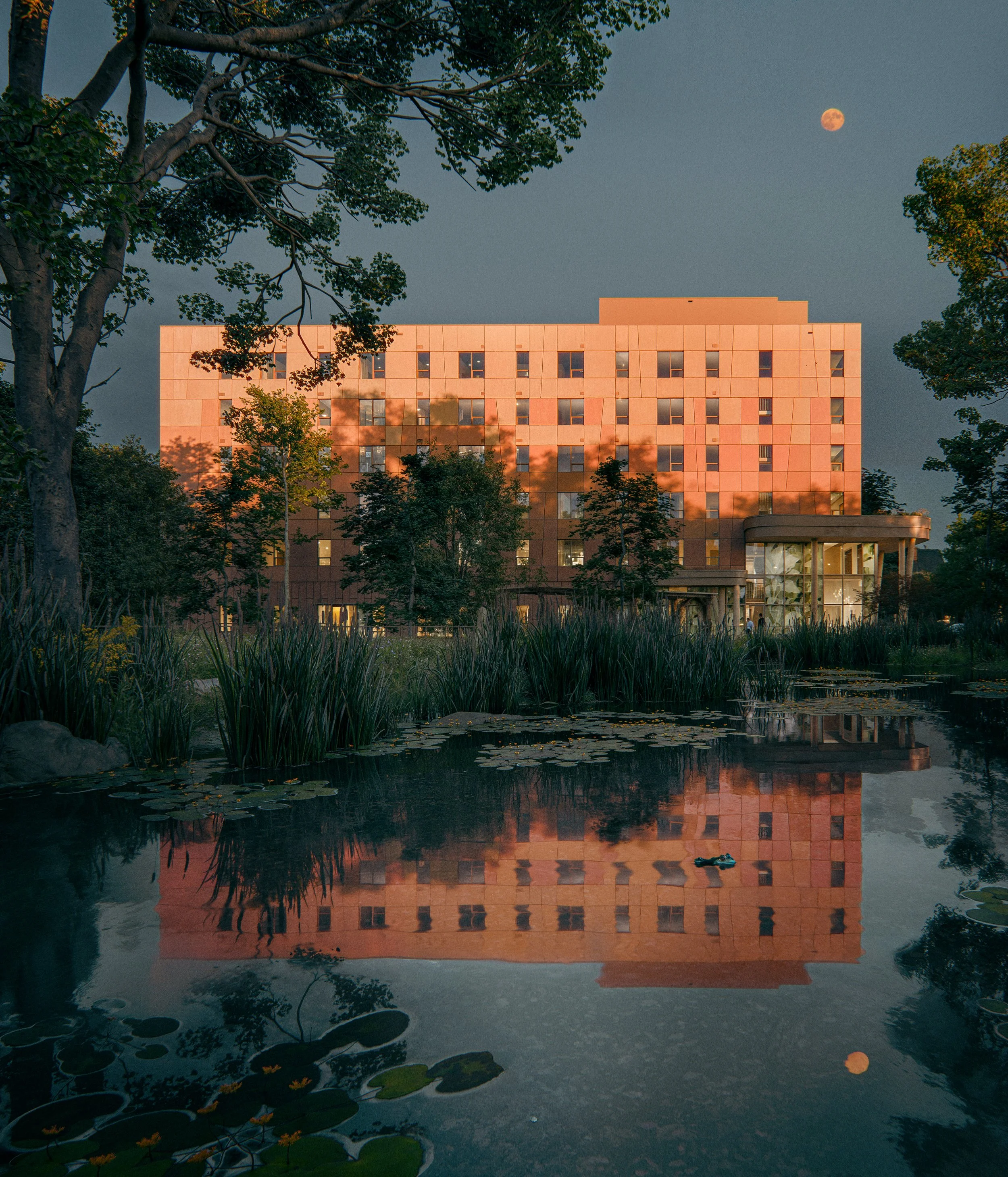 Architects are mcCallumSather, David T. Fortin Architect, and Parkin Architects. SpruceLab is providing landscape architecture and urban design services, as well as engagement support. Our expertise in Indigenous and nature-based design will support meaningful Indigenous place keeping that offers healing, biodiverse places for community, with myriad ecological services (urban cooling, stormwater management, air quality improvements, etc.). To read more about this exciting and precedent-setting project, see mcCallumSather’s post here, and Housing, Infrastructure, and Communities Canada’s post here. Plan rendering below by SpruceLab, perspective renderings by Office in Search of.