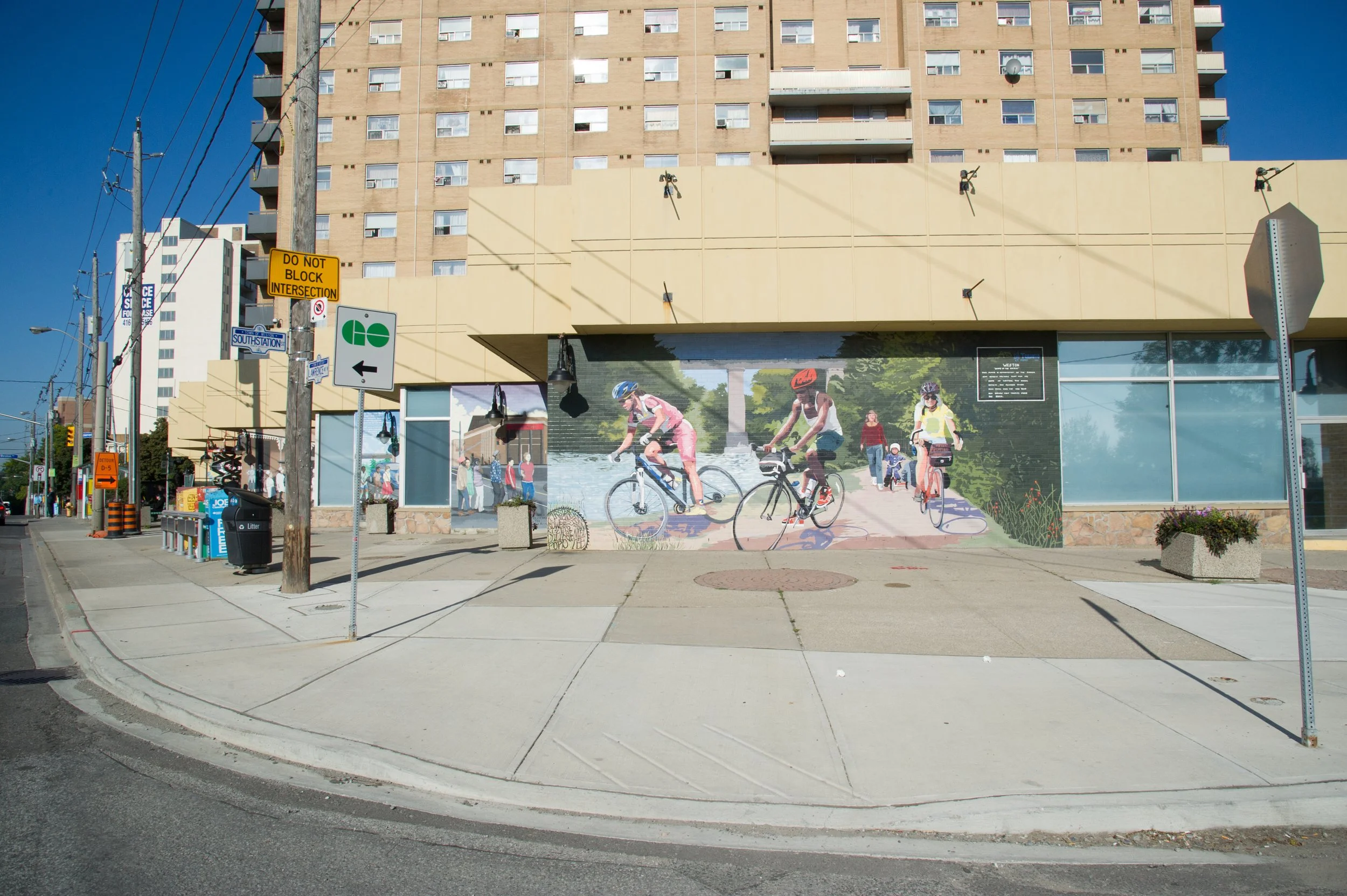 This project (2013 - 2015) originated as a public realm improvement initiative with the Weston Village Business Improvement Area, and the Urban Land Institute of Toronto. Decreasing the wide road surface created more generous walkways, with bioretention tree plantings on both sides of the street. Large planting beds with limestone capped seatwalls were installed along Lawrence Ave. W, and an artist was hired to design a corten steel bike stand (inspired by the area’s cycling industry history). This was the first green infrastructure design of its kind in the city, and there are plans underway to expand the design approach along Lawrence Ave. W.. Supported by the local Councillor, the street is now a preferred pedestrian route to access the new Weston GO Station.